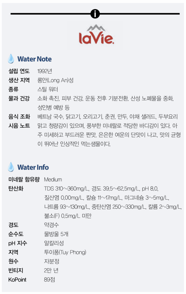 롱안성의 라 비에 먹는샘물의 TDS는 310~360mg/L며, 경도는 39.5~62.5mg/L로 약경수고, pH 8.0으로 알칼리성 물로 다양한 미네랄을 함유하고 있다. 또한 맑고 청량감이 있으며, 풍부한 미네랄로 적당한 바디감과 부드러운 목 넘김이 좋은 매력적인 먹는샘물이다. 호텔 레스토랑을 찾아오는 고객에게 베트남에서 최고의 수질로 인정받고 있는 소화에 좋은 물이라고 소개하면 좋다. 특히, 소화 촉진, 피부 건강 체내 독소를 제거하고, 피부를 정화하며, 젊음과 활력 넘치는 건강을 얻는 데 도움이 되는 먹는샘물로 설명하고, 음식과 조화는 베트남 국수, 닭고기, 오리고기, 춘권, 만두 등을 추천하면 되겠다.